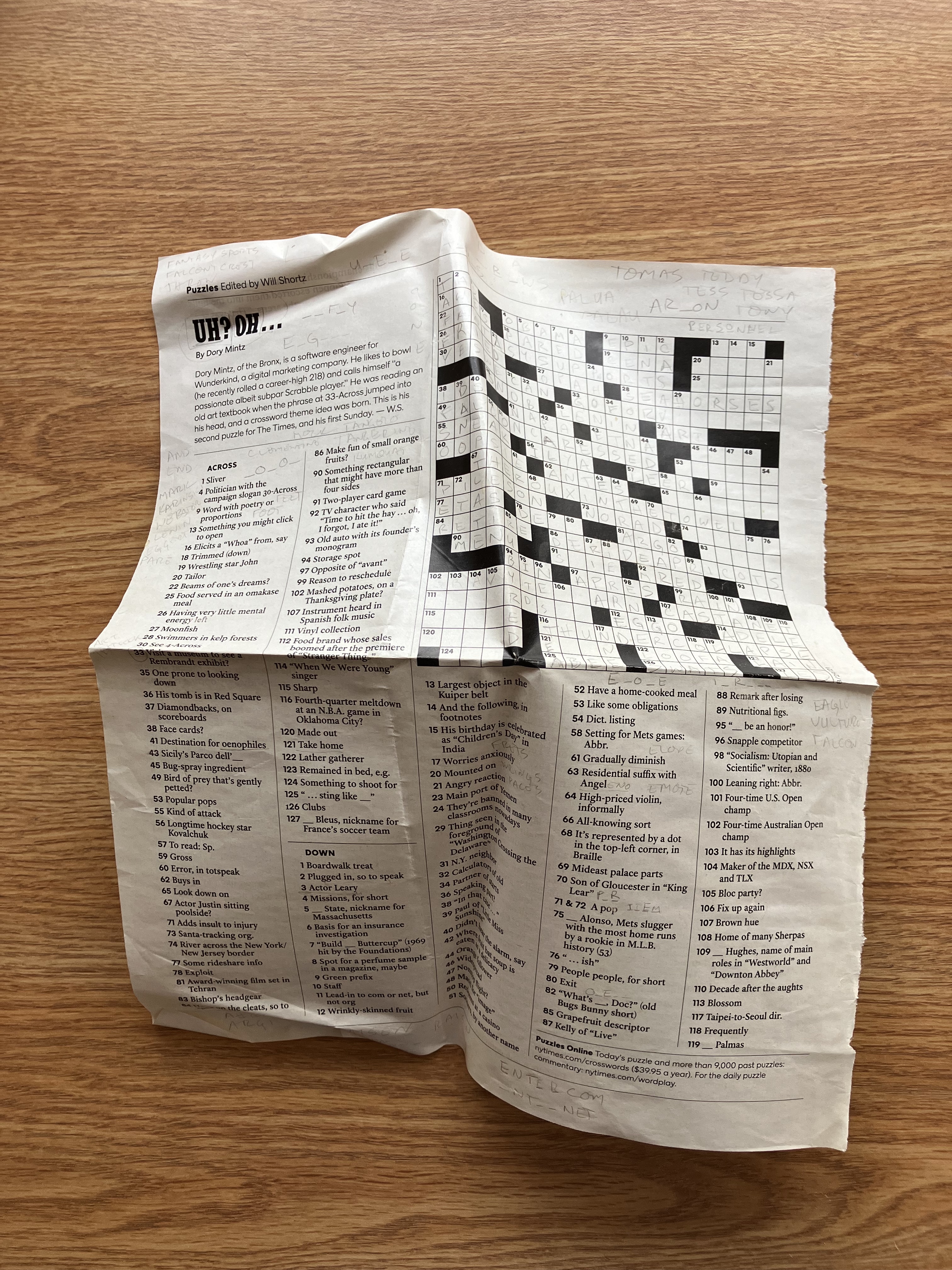 This half-finished crossword puzzle reminds me of my mother. After I left for college, one of the ways my mother and I would connect with each other when I came home for summer and winter breaks was to work on crosswords together. She makes coffee at like 5am, and around 6:30 or 7 I roll out of bed to the smell of something delicious she's making like bacon or cinnamon rolls from the farmer's market, and then we sit at the counter and sip coffee, eat, and do the crossword until she has to go to work. It sometimes takes us weeks to finish one because we only work for like 15 minutes each morning and I spend half my time at my dad's, so we must not have finished this one, and it somehow ended up with me. When I pick up this yellowing page torn from a magazine, I think of my mother, and our mutual love of learning new things, and of college, and leaving home, and the pandemic, and isolation, and the love that crosses time and space.